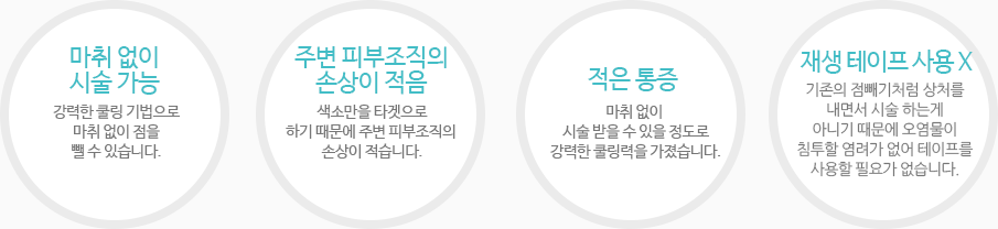 클라리티의 아이스점빼기 시술은 강한 냉각시스템을 이용하기 때문에 마취와 출혈 없이 시술이 가능합니다. 또한 시술 후 테이프를 붙이지 않아도 되는 시술로 재생테이프를 붙이는 것을 싫어하시는 분들에게 추천합니다.