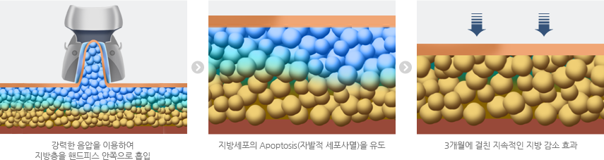 - 2.혈액순환이 줄어든 상태에서 지방층을 냉각하여 지방층염을 발생시킴으로써 지방세포의 Apoptosis(자발적 세포사멸)을 유도합니다.