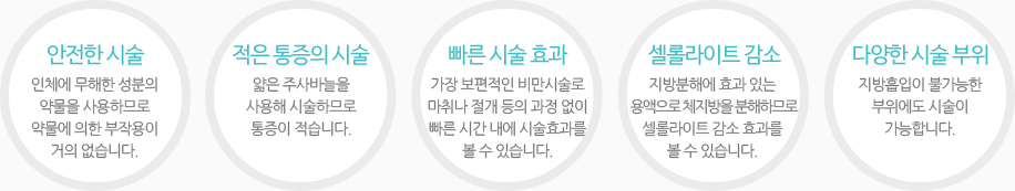 - 2.지방분해 주사 주입 후 몸 속에 지방을 녹이고 말초 혈관 및 림프 순환을 촉진시켜 체내 노폐물을 배출시킵니다.